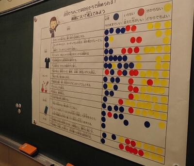 現在の東中の校則の一部を使って、必要・どちらでもよい・いらないを選択し、理由を考え、発表していました。