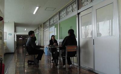 生徒が英語科教員とAETを前にしてスピーキングテストに取り組んでいました。