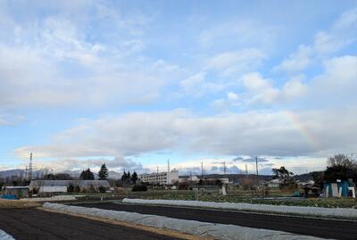 今朝、学校に近付くと、うっすらと虹が見えました。