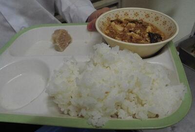 今日の給食のメインのおかずは、麻婆豆腐とシュウマイ2個です。