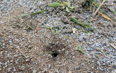校庭の土を見ていると、アリの巣穴があいているところがあります。