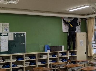 朝、まだ生徒がいない校内をめぐると、ある教室では教員が、何やら作業中です。