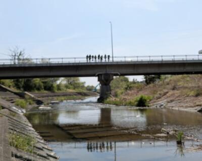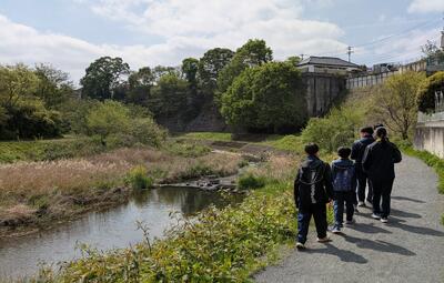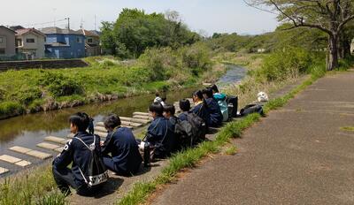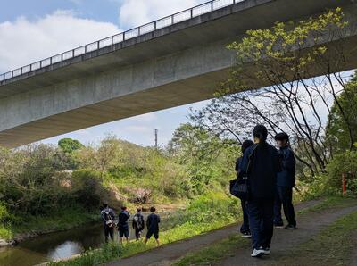 37名が五つの班に分かれ、学校から約3時間かけて川沿いを歩きます。