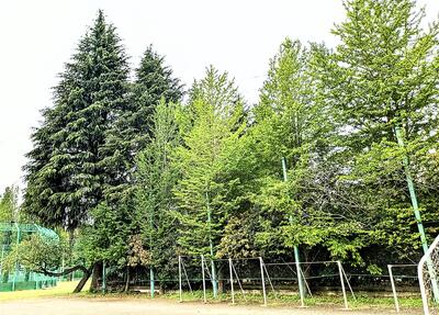 校庭にある木々の緑が色濃く、鮮やかに見えます。
