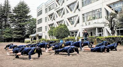 体操をした後、補強運動として腕立て伏せやスクワットを行っていました。
