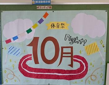 10月1日(水) 今日から10月! 投稿: 校長 (14:30) カテゴリー: 今日の出来事 今日から10月に入りました。 ハロウィンの飾りがいいですね。 本日予定していた体育大会予行は、雨のため明日に延期です。 まあ、予行も本番も予め予備日を決めてあるので、落ち着いていきましょう。 校内を巡っているとボランティア部が制作したものが廊下に掲示されていました。 体育大会の係とは違った取組ですが、少しでも良い行事となるような願いを感じます。 Tweet -